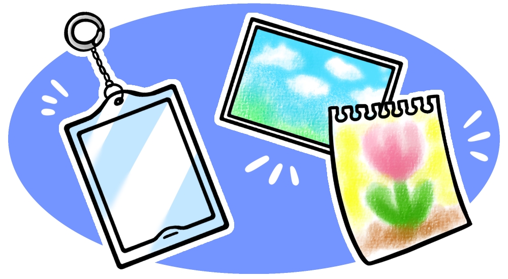 レジンなんかのオシャレグッズではなく、イラストや写真を使ったキーホルダーを作りますよ。